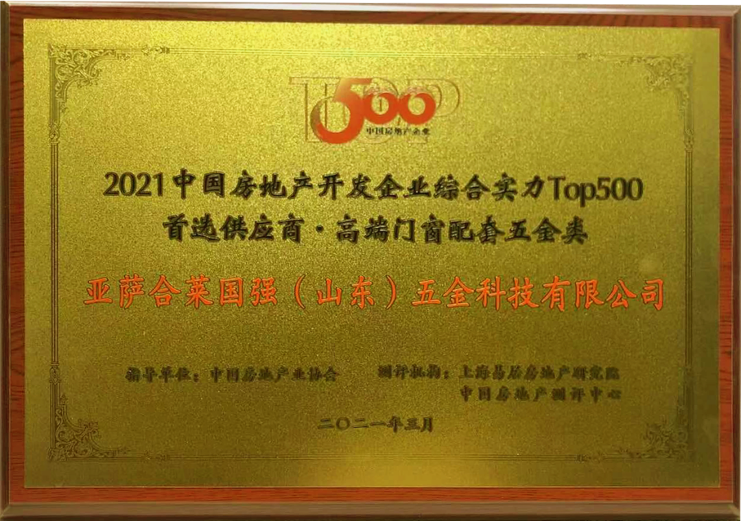 亚萨合莱国强五金入围2021年中国房地产开发企业综合实力top500系统窗类首选供应商!