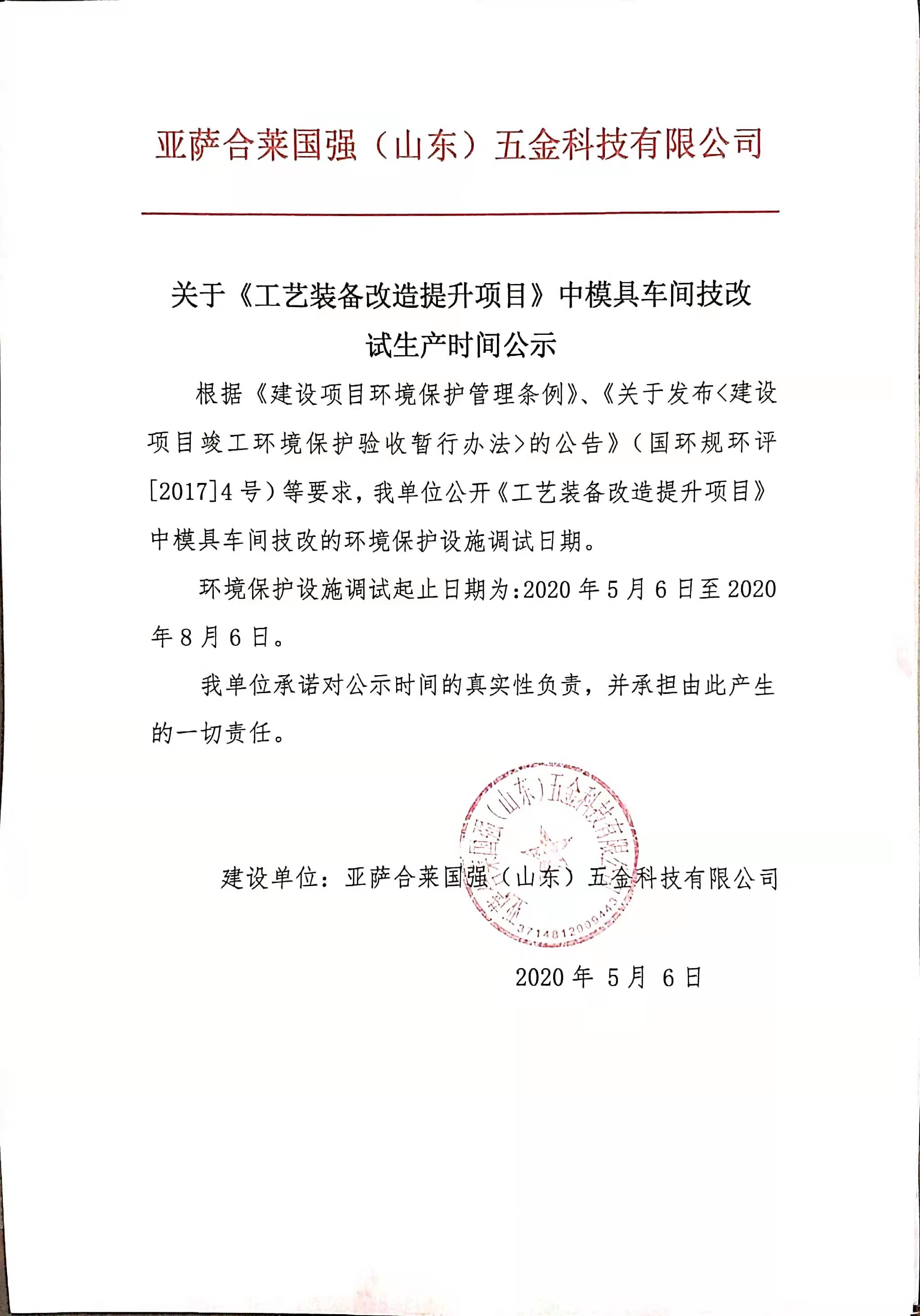 关于《工艺装备改造提升项目》技改生产时间延期公示
