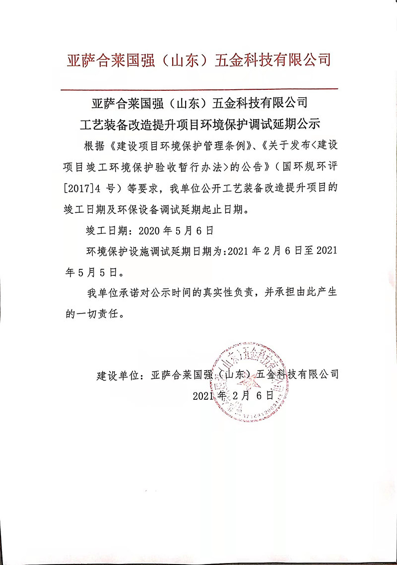 亚萨合莱国强五金工艺装备改造提升项目环境保护调试延期公示-尊龙凯时网页版
