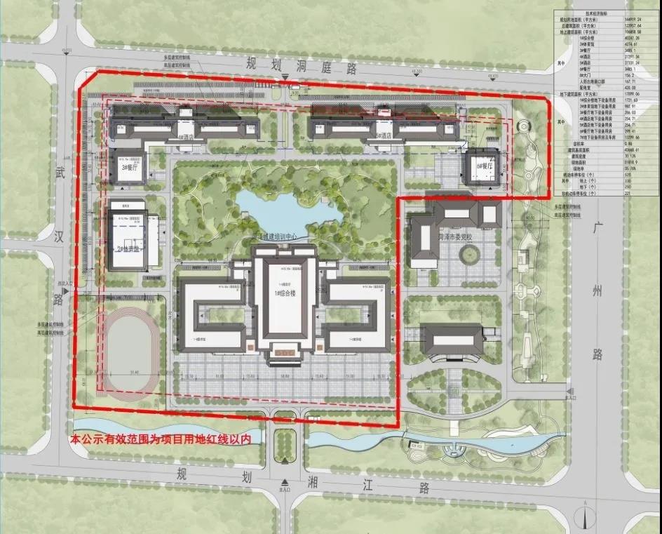 菏泽城建培训中心用地面积144919.24平方,总建筑面积123957.64平方米,规划有1#办公教学楼、2#体育建筑、3#餐厅共3座(均地上3层,地下1层),4#、5#酒店共2座(均地上12层,地下1层),7#地下室(含管廊,地上1层,地下1层),8#大门、9#连廊、10#配电室共3座,其中地上建筑面积106858.58平方米,容积率0.86,建筑密度30.13%,绿地率35.76%,机动车停车位620个,其中地下停车位290个。