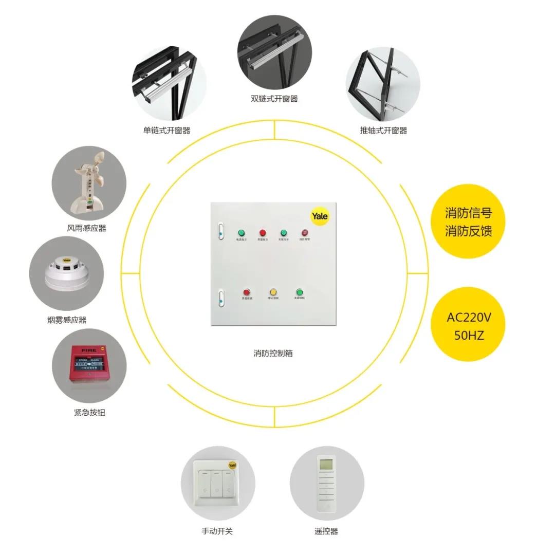 系统除具备自然通风的功能外,当出现火灾情况时,系统中的火警紧急报警装置或手动火警报警装置会将消防信号传送至消防控制箱,经消防控制箱处理后启动开窗器,实现排烟排热功能。