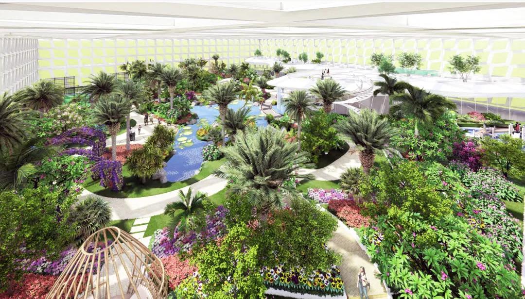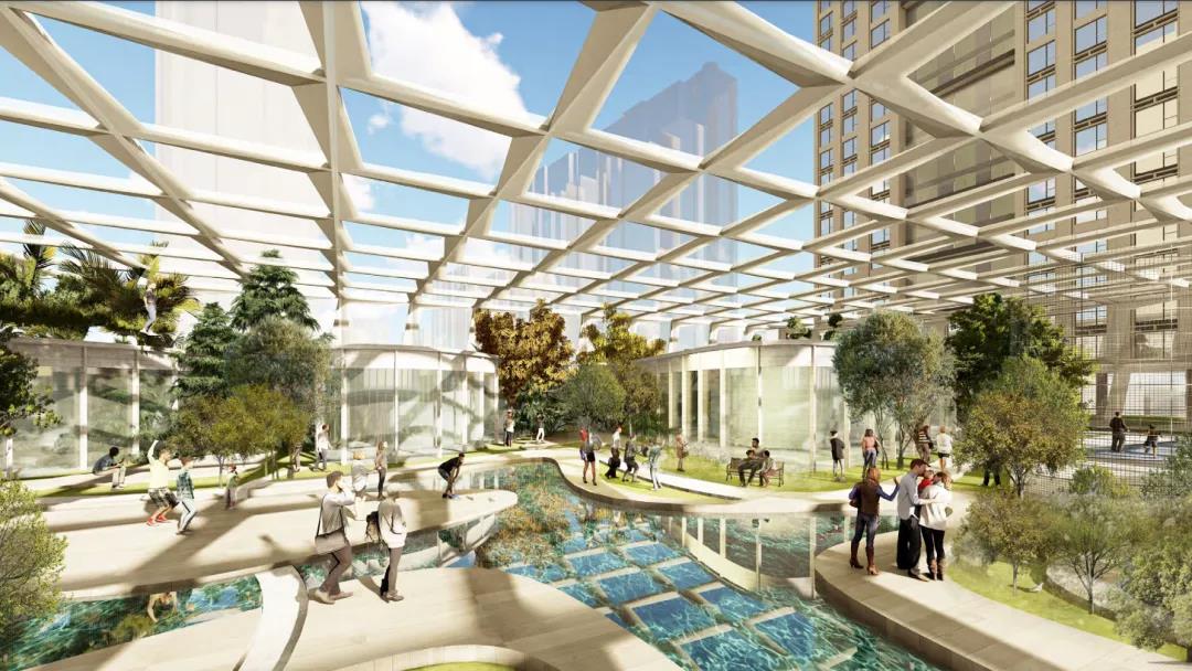 屋顶花园,玻璃幕墙顶的面积 4500 ㎡左右,采光方式为自然采光,智能开启;整体采用钢结构,开启屋面及侧面开窗通风面积达到1000 ㎡,开窗通风面积达到屋顶花园面积的 22%, 并通过采用全自动电脑联动监测技术,以满足植物的生长环境。