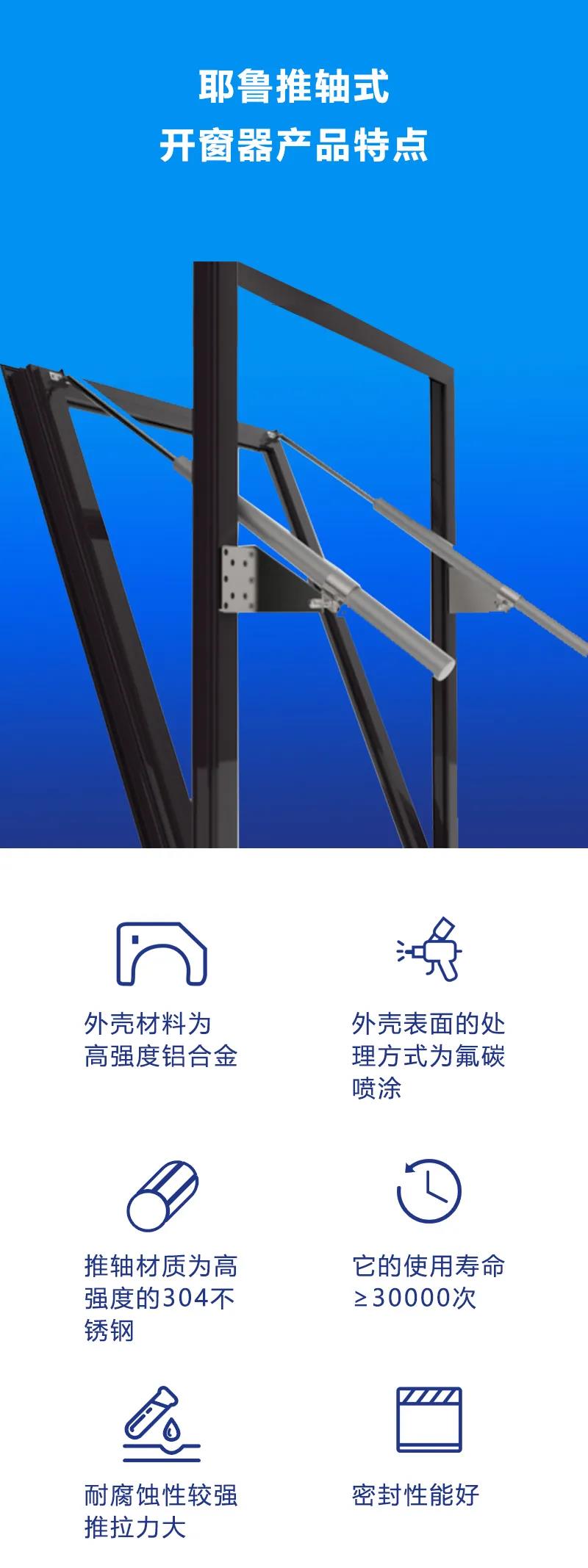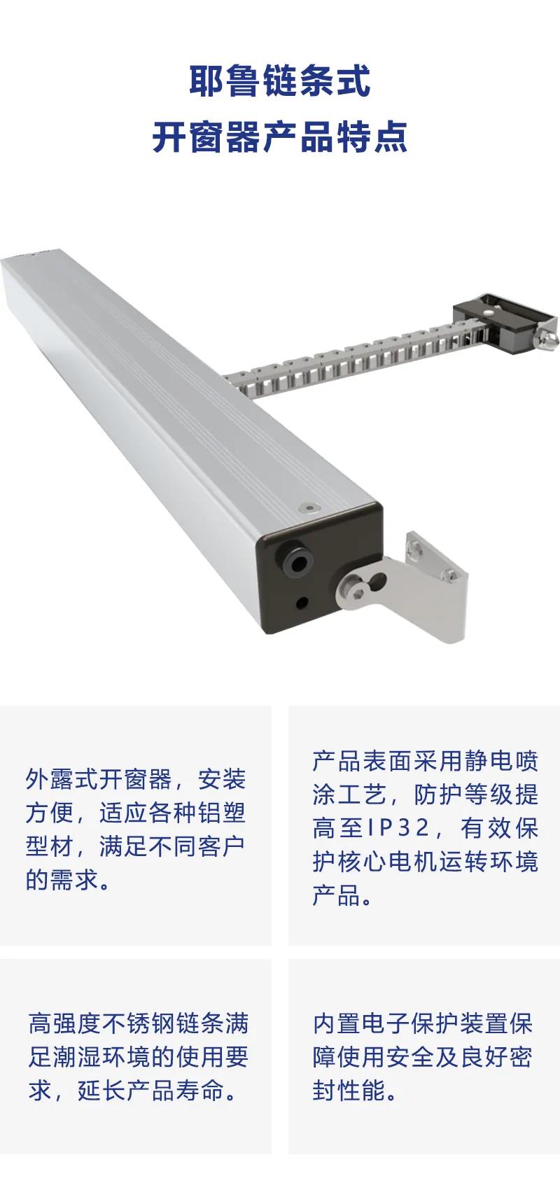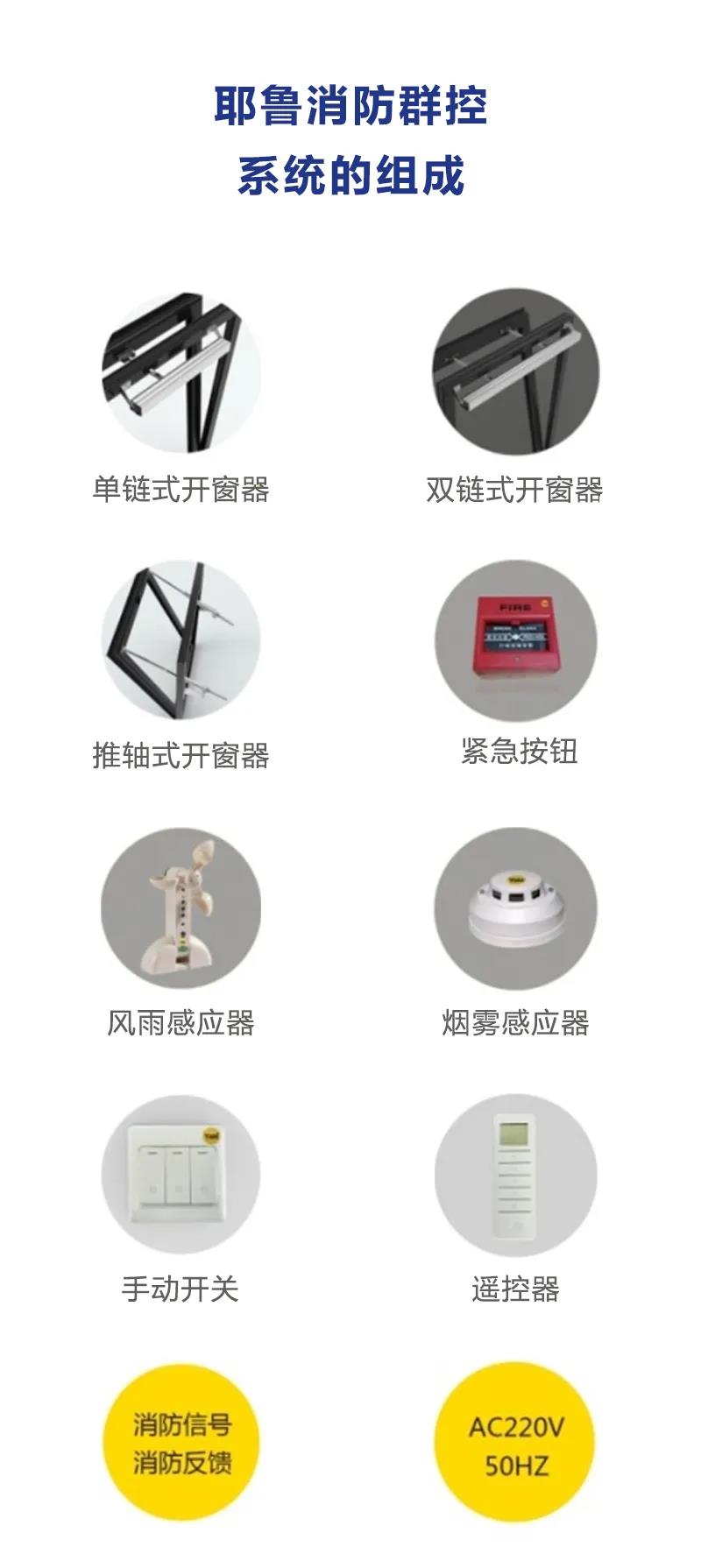 耶鲁消防群控系统由消防控制系统、链条式开窗器、推轴式开窗器等组成。系统除具备自然通风的功能外,当出现火灾情况时,系统中的火警紧急报警装置或手动火警报警装置会将消防信号传送至消防控制箱,经消防控制箱处理后启动开窗器,实现排烟排热功能。控制箱内部具有自我监控功能和状态显示功能;当消防联动系统有消防信号输入时,可使电机完全打开。