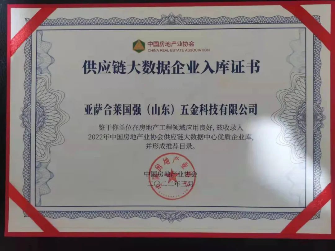 亚萨合莱国强(山东)五金科技有限公司凭借领先的综合实力,荣登2022年中国房地产开发企业综合实力top500首选供应商 门窗五金类10强。