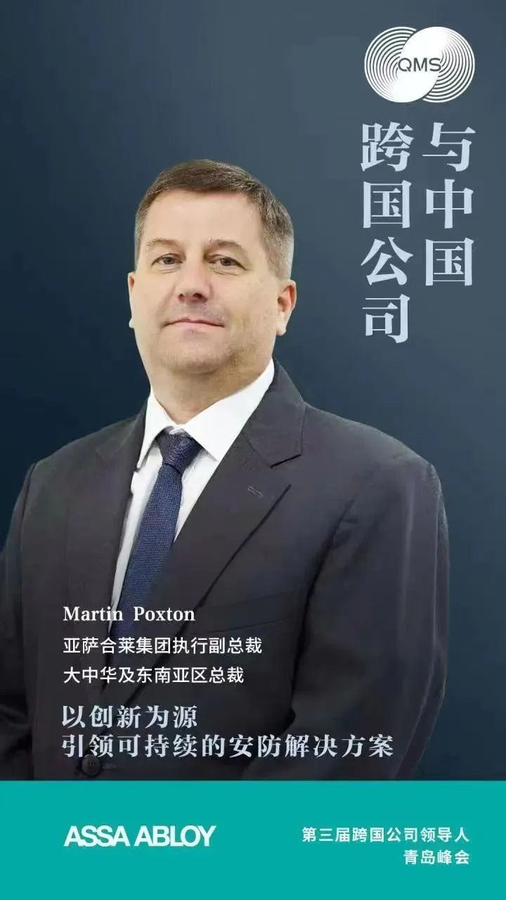 亚萨合莱集团第三次受邀参加青岛峰会,彰显主办方对于亚萨合莱作为跨国企业在中国发展的肯定。亚萨合莱集团全球执行副总裁兼大中华及东南亚区总裁,martin poxton先生,代表集团全方位、深度参与此次峰会的多项议程,与众多来自世界500强企业及全球行业领军企业的领导人一起,探寻跨国公司在中国即将迎来的更大发展机遇。