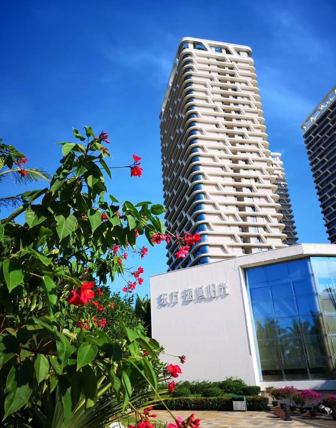 外立面引入海洋元素“海浪”、“沙滩”的造型,蓝色的玻璃幕墙、白色富有线条感的墙面、简单干净的窗边线条,像极了天际线旁的海浪和云朵,创新的设计,让美观与实用性兼具。