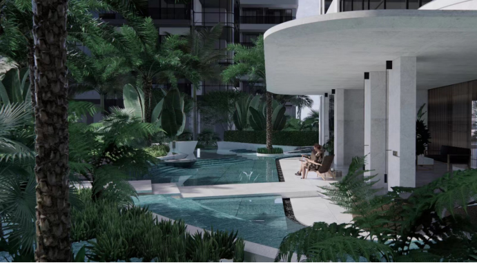 除了全年瞰海的福利,社区内还设计与水有关的功能区——热带园林 温泉入户 百米泳池。