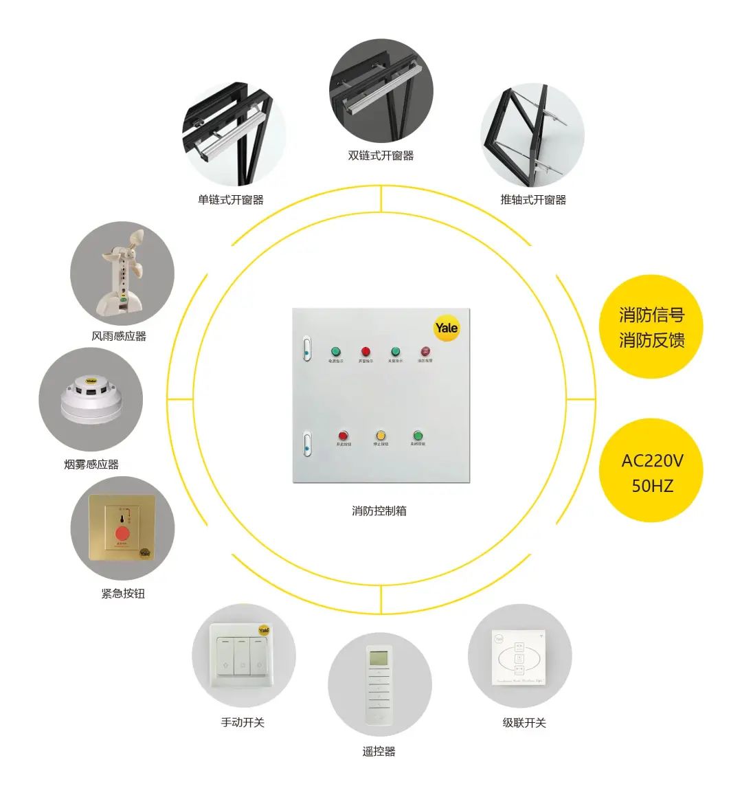 本系统由消防控制装置、推轴式开窗器、链条式开窗器、手动开关、紧急按钮等组成。系统除具备自然通风的功能外,当出现火灾情况时,系统中的火警紧急报警装置或手动火警报警装置会将消防信号传送至消防控制箱,经消防控制箱处理后启动开窗器,实现排烟排热功能。控制箱内部具有自我监控功能和状态显示功能;当消防联动系统有消防信号输入时,可使电机完全打开;通过cccf认证、ce认证。
