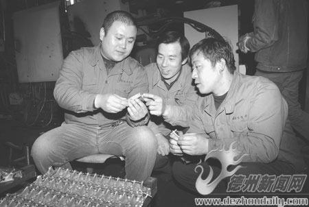 12月30日,德州国强五金制品有限公司压铸车间农民工张春荣(左一)与同事们一起探讨研究五金件的压铸技术。张春荣原在天津市造船公司工作,受金融危机的影响,企业停产,11月9日他返回家乡。回来后,他就在市劳动和社会保障局的帮助下找到了这份工作。据了解,该市已有4200名返乡农民工在家乡重新就业。