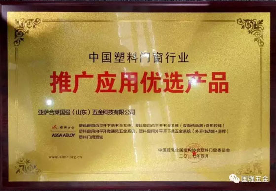 此次年会,不仅是友情的盛会,更是开创未来的盛会。国强五金,非常重视这一难得的交流机会,相互学习、相互探索,并对公司未来发展方向提出了新的要求。展览会期间还对在2016年做出突出贡献的企业和项目进行了表彰,公司“塑料窗用内平开下悬五金系统”、“塑料窗用内平开五金系统(双向传动 隐藏铰链)”、“塑料窗用内平开微通风五金系统”、“塑料窗用外平开下悬五金系统(外开传动器 划撑)”、“塑料门用滑轮”获得了“推广应用优选产品”称号。